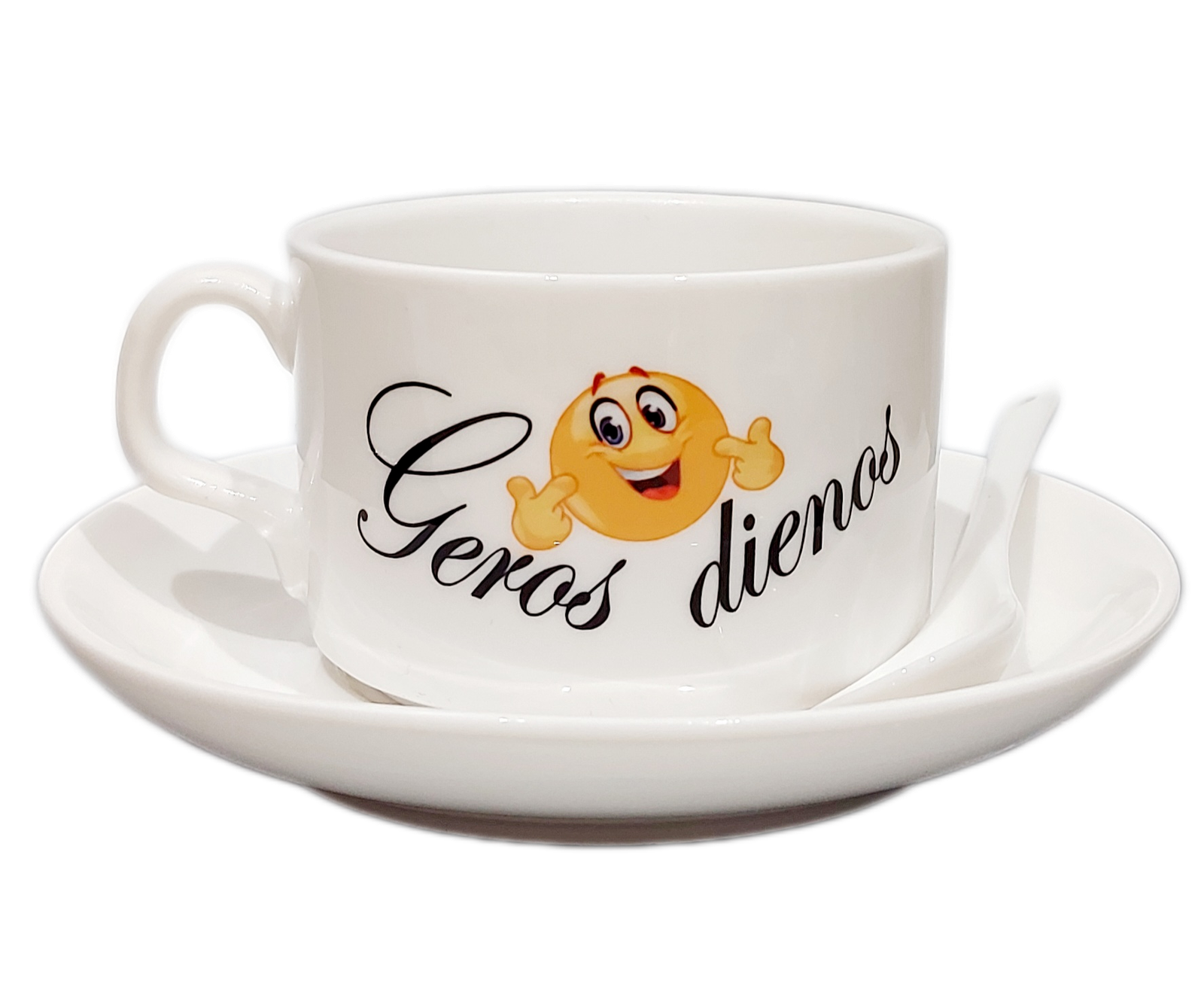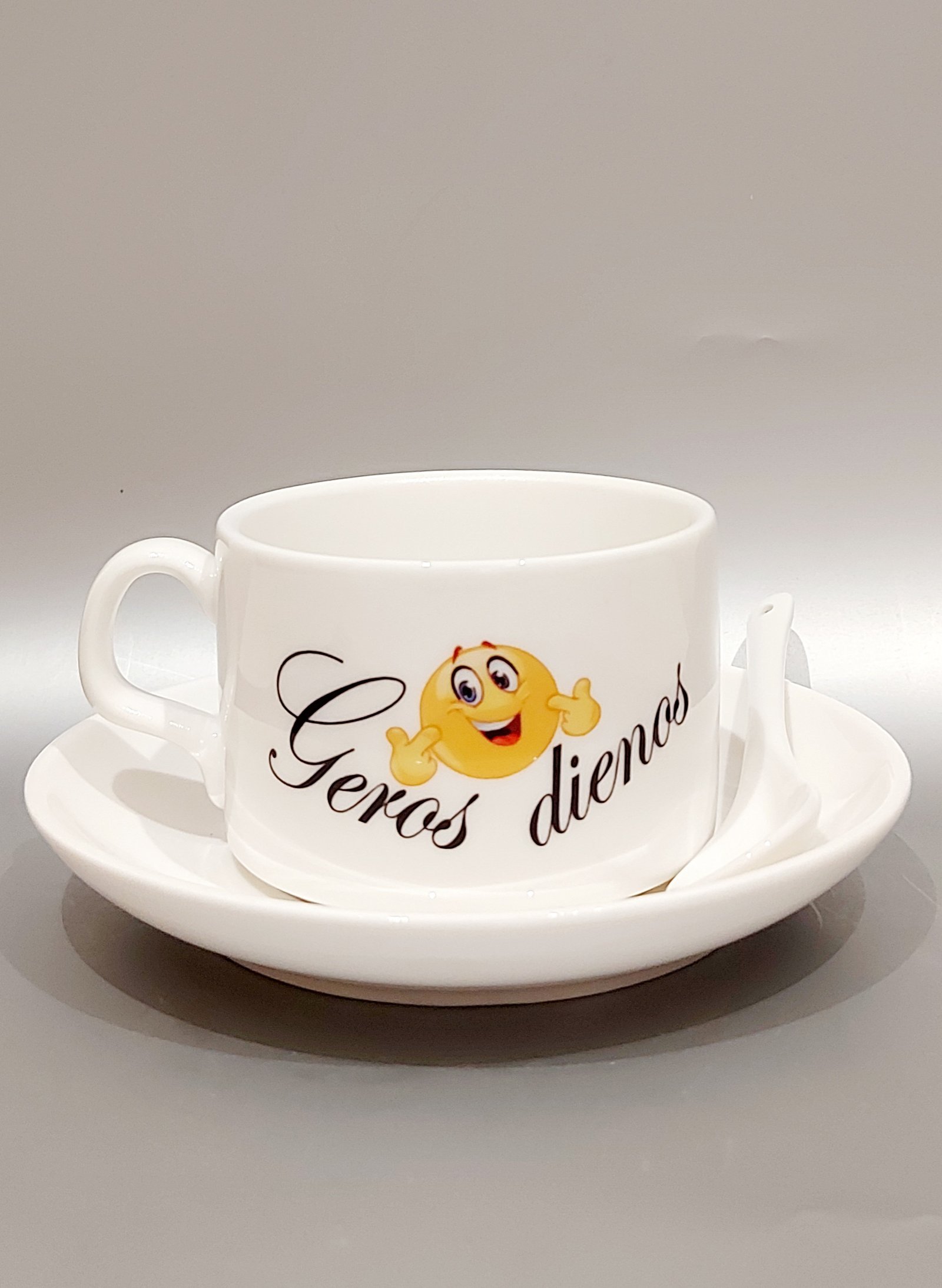 Komplektą sudaro puodelis, šaukštelis ir lėkštutė