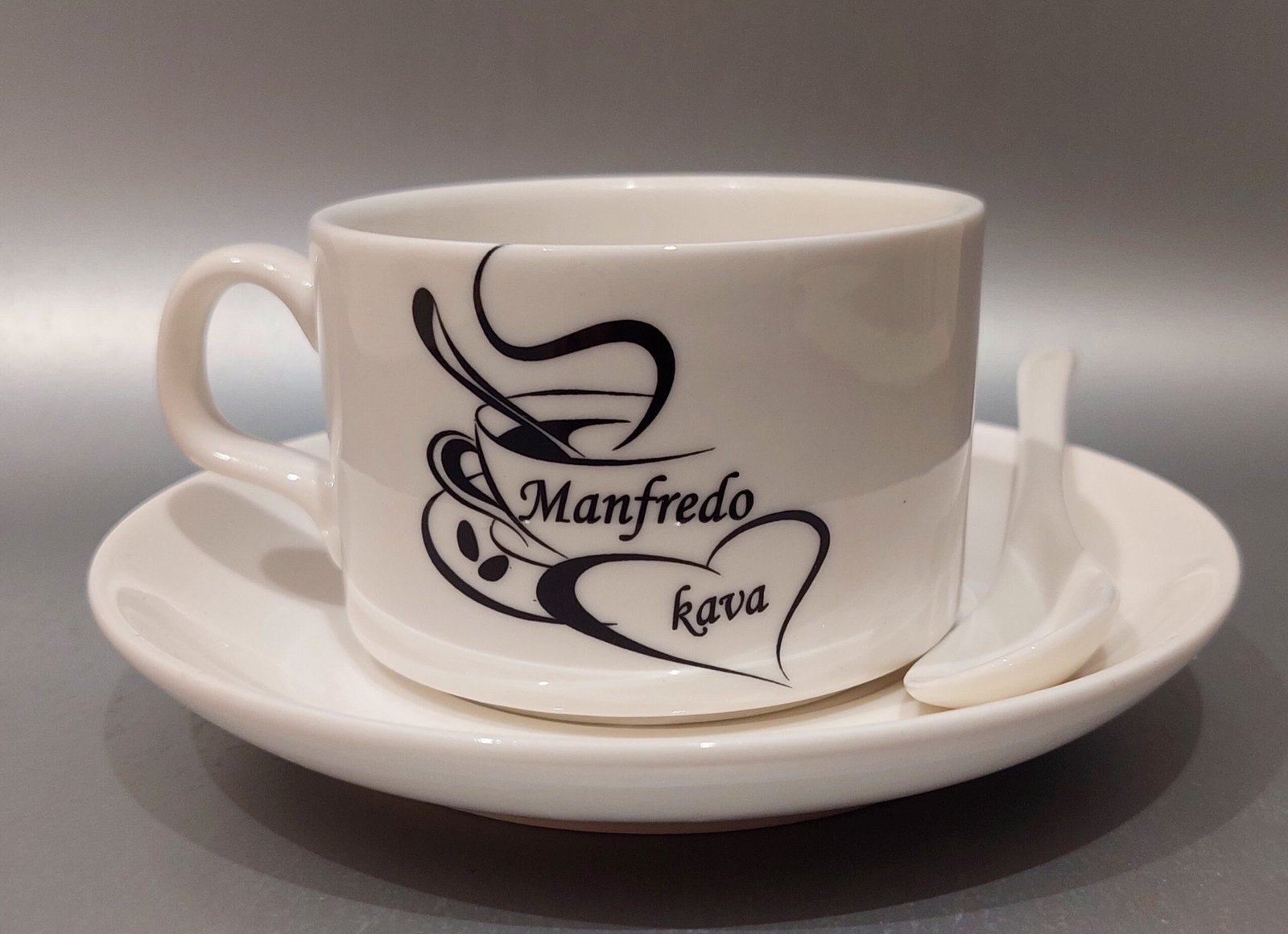 Komplektą sudaro puodelis, šaukštelis ir lėkštutė