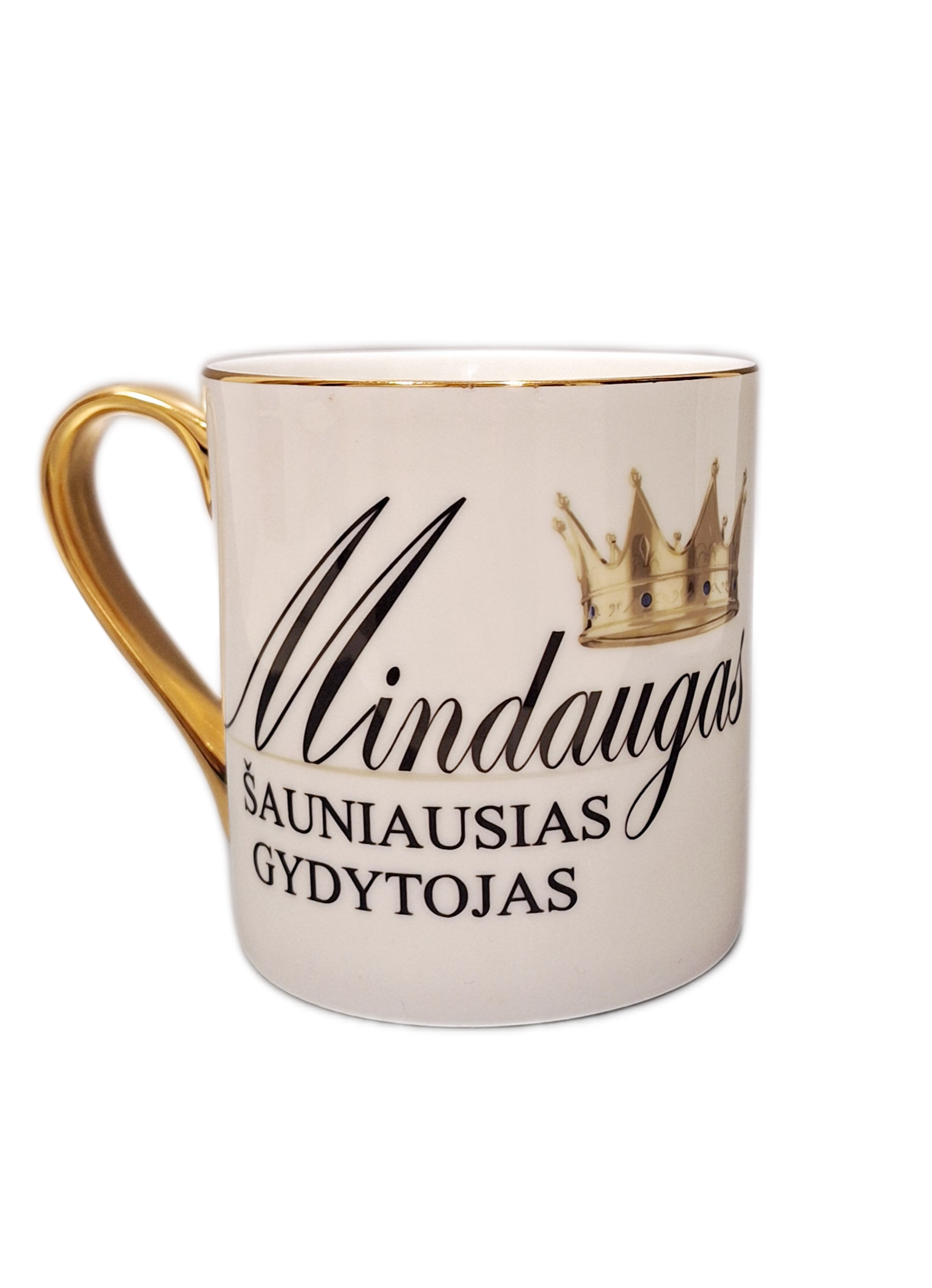 Prabangus porcelianinis puodelis su aukso spalvos rankenėle.