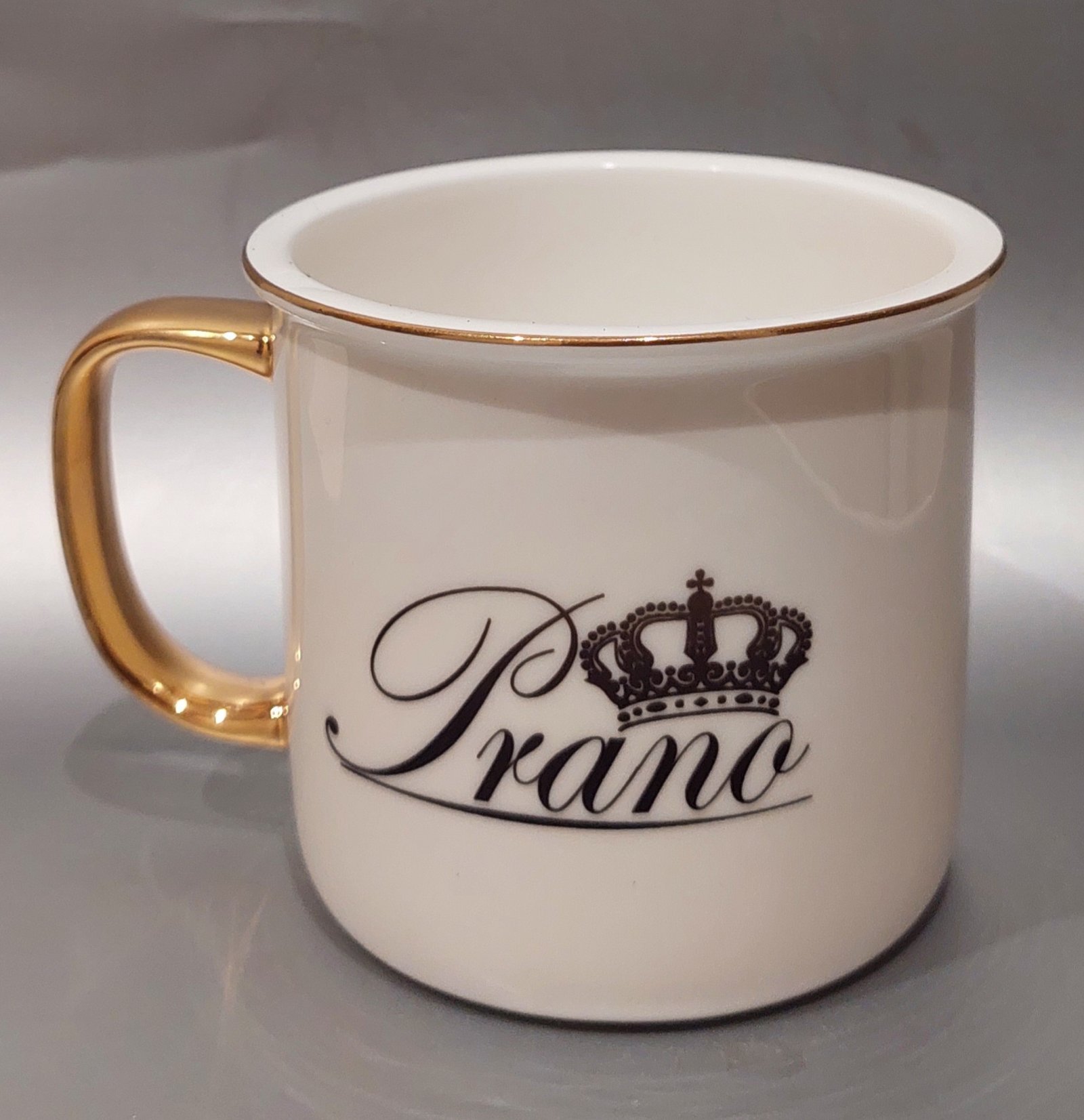 Prabangus porcelianinis puodelis su aukso spalvos rankenėle.